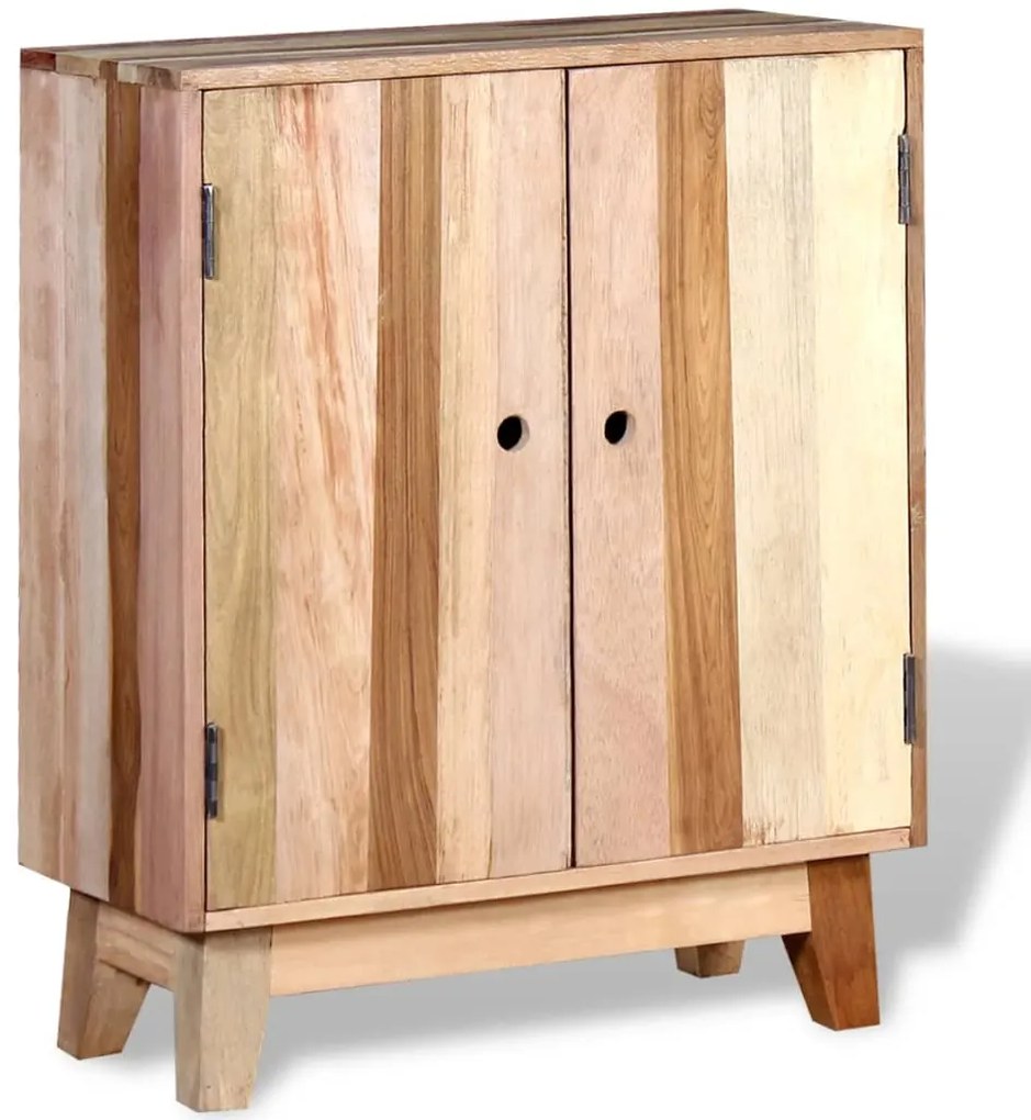Този страничен дървен шкаф в античен стил, който се предлага с 2 врати и 2 рафта, ви предлага достатъчно място за съхранение и ви помага да поддържате вещите си в страхотен ред. Можете също да поставите вашия компютър, таблет, книги, тоалетни принадлежности или някои декорации върху здравата горна повърхност. Независимо дали става дума за шкаф във всекидневната, или за скрин в спалнята, шкафът от регенерирано дърво е добър избор. Може да се използва и като странична маса, бюфет, висок шкаф, конзолна маса и др. Този шкаф за съхранение е изработен от масивна регенерирана дървесина, което означава, че всяка мебел е уникална и малко по-различна от следващата. Мебелите, изработени от регенерирана дървесина, притежават характеристиките на различни дървета като тик, манго и акация. Регенерираната дървесина е солидна, стабилна, издръжлива и красива. Признаците на износване и видимата зърнеста структура придават на всеки артикул собствена история и уникален вид. Шкафът е ръчно изработен, а майсторската изработка допринася за ефектния му ретро стил. Всяка стъпка от процеса се извършва с най-голямо внимание – било то полиране или лакиране. Важна забележка: Цветовете варират, което прави всеки от нашите сайдборди уникален; доставката е на случаен принцип.