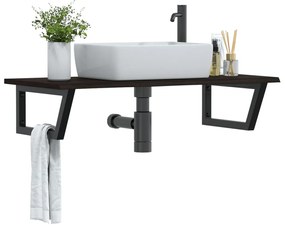 Стенният рафт за мивка се прикрепя сигурно към стената, осигурявайки елегантно и спестяващо място решение за вашата баня. Здрав и дълготраен: Този рафт за мивка е комбиниран със стоманена конструкция и плот от масивна дъбова дървесина, което го прави здрав, стабилен и дълготраен.Спестяване на място: Плаващият рафт за мивка има достатъчно място за съхранение на кремове и дребни предмети. Благодарение на трапецовидната форма можете да закачите кърпи или други неща на опората, за да спестите място.Лесен за използване: Плотът се доставя без дупки, за да позволи на мивката да се монтира отляво, отдясно или в центъра, в зависимост от изискванията на вашето помещение. Благодарение на предварително пробитите отвори в държача, той може лесно да се сглоби с плота и да се монтира на стената.Широки приложения: Благодарение на модерния си дизайн, осигурява допълнително пространство за различни видове бани. Добре е да се знае:Винтовете не са включени, можете да закупите винтовете отделно въз основа на информацията, предоставена по-долу.Прикрепване към стена: 2 бр дюбели M8 на скобаДървен плот: 2 бр M5x18 винта (T=2) или 2 бр M5x20 винта (T=2,5/4 см) на скобаКато естествен продукт, дървото може да има възли и несъвършенства, които ние запълваме с черни пълнежи, за да осигурим гладък външен вид.