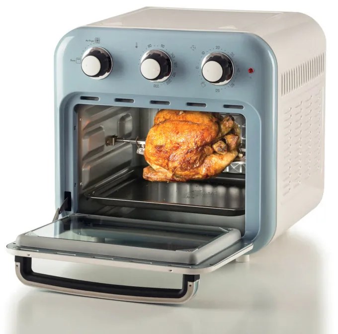 С фурната с горещ въздух Air Fryer Vintage 16L можете да пържите всякакви ястия в големи количества, като използвате само една лъжица мазнина, за да получите здравословно и вкусно пържене едновременно. Благодарение на голямата вместимост от 16 литра, можете да приготвите големи количества храна наведнъж! Пържени картофкии, но и не само! Крокети, риба, месо и много други панирани храни, както замразени и готови за пържене, така и пресни и прясно панирани. - Мощност: 1400 W - Капацитет: 16 литра - Регулируема температура от 80 до 230°C - Прозрачна вратичка с двойно стъкло - Механичен контрол - Таймер до 60 минути - Вътрешна светлина - Включени аксесоари: 3x Перфорирани кошници от неръждаема стомана 1x Въртяща се кошница от неръждаема стомана 1x Решетка от неръждаема стомана 1x Комплект за грил от неръждаема стомана 1x Тавичка - Размери: Височина: 34 см Ширина: 34 см Дължина: 34 см - Цвят: Бял/Светлосин